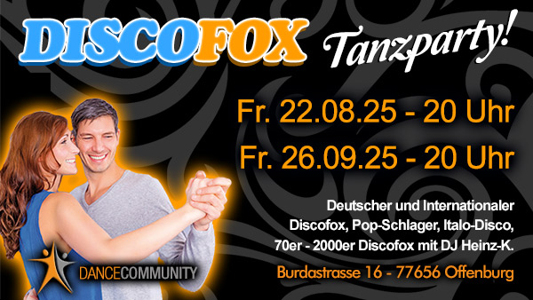 Einen ganzen Abend lang tanzen wir im 4/4 Takt zu deutschem und internationalem Discofox, Pop-Schlager, Italo-Disco und 70er-2000er Discofox.