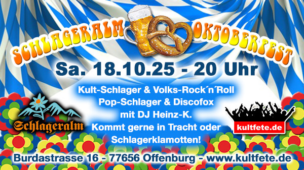 Wir feiern wieder zünftig in Tracht oder Schlagerklamotten das "Schlageralm-Oktoberfest" in Offenburg!